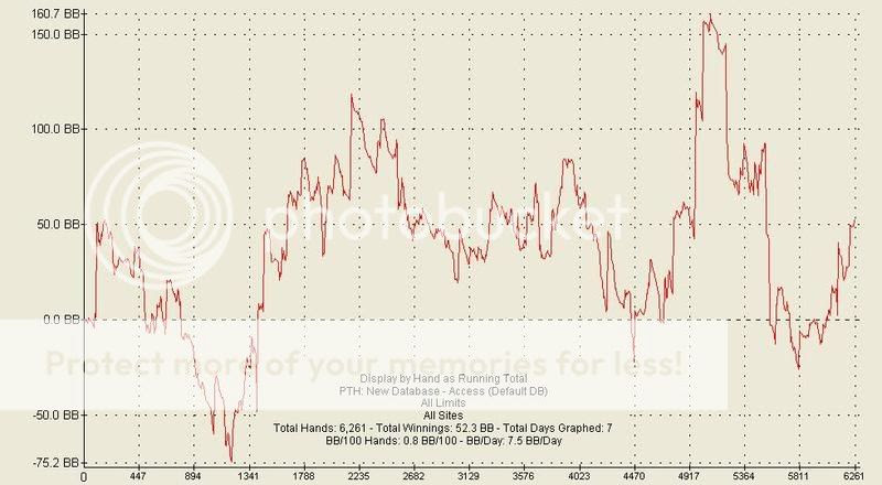 I wrote a long post already and lost it so here’s a shorter version :-P. Started the week terribly and was down 3 buyins after 3k hands on Wednesday. I was completely card dead and had a couple of bad beats and wasn’t playing well either. I took a break on Thursday to try and let all the info I’d been reading sink in a little bit. I think a break is definitely a good idea every now and then just to let your brain digest all the crap instead of constantly firing theory and play at it. Anyway, came back Friday, and ran better (played better too I think). My VP$IP and PFR and Att. To Steal are all looking more respectable and my W$WSF is also heading in the right direction, though this week was a terrible one to gauge as I was hitting nothing. My numbers in non-showdown pots are also much better. On Saturday I actually won money in non-showdown pots, which must be a first. My modem is screwed, so I won’t be able to play properly until Wednesday, which is when I head back to Ireland for an interview, so I can’t see myself putting a lot of hands in. I think I did well on the tasks I set for myself last week. Not going to do any this week as it’ll be a quiet week. I’m only breakeven at $50nl over 10k hands which I’m not happy with, but I’m definitely a much better player than when I started, so I’m not too concerned and I think I’ll be able to beat it now when the cards start to fall for me! I’m a lot more interested in being good enough to play at $100nl before moving up now, rather than just moving up when I have the bankroll, so I’m happy to stay at $50nl and keep learning. In any case I’m still a fair way off even having the bankroll, so March would be by rough goal for moving up.